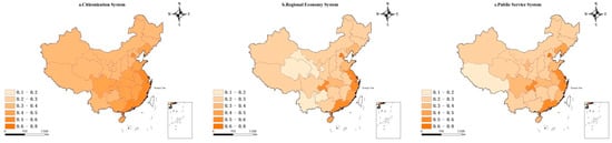 The development level of each system varied significantly from region to region, and the overall trend was “high in the east and low in the west”. In the spatial distribution pattern of the three systems, there were noticeable regional differences in the “citizenization, regional economy, public service” system, as shown in Figure 3. Figure 3a–c show the distribution of citizenization level, economic development level, and public services level by province in 2018. The darker the color, the higher the score. More detailed data are presented in Table 6. We found that economically developed areas such as Beijing, Shanghai, Zhejiang, Jiangsu, Guangdong, and other eastern coastal provinces enjoyed higher scores in the three systems. In contrast, the underdeveloped western parts such as Guizhou, Gansu, Yunnan, Qinghai, and Tibet had lower scores. Overall, the spatial characteristics of China’s “citizenization, regional economy, public service” system showed a gradient distribution pattern that gradually decreased from east to west.