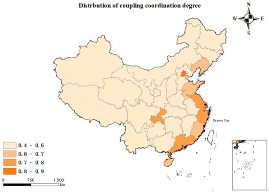 Distribution of coupling coordination degree of “citizenization, regional economy, and public services” system by province in China (2018).
