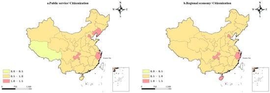 The public service supply and economic development level in most provinces lagged behind their citizenization level. Public service supply and economic development lagged behind citizenization in 24 out of 31 provinces, of which Tibet, Henan, Guangxi, and Gansu held the largest gap. See Figure 5 for details. While the citizenization of these provinces was inadequate, their public service supply and regional economy scores were even lower. It implied that the citizenization progress in these provinces was more motivated by administrative directives than by economic development and the improvement of public service supply. The level of citizenization was not “the higher, the better”. The one that matched the development levels of economy and public service is the best. Passive or excessive citizenization driven by the administrative directives from provincial governments might create new urban–rural contradictions or social conflicts, which are not conducive to sustainable development.
