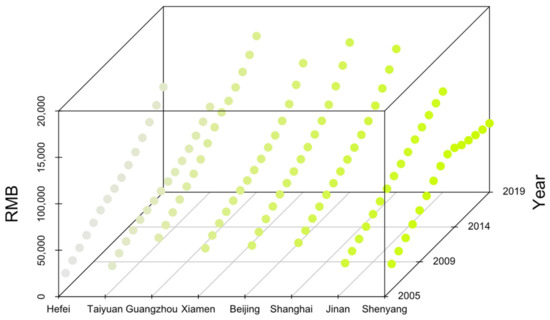 A three-dimensional scatter plot of the indicator data is generated for the ease of observing the precise form of the data. The study cannot provide all the cities and indicators included in this article because of their sheer number. Accordingly, 8 cities are selected from 33 cities, and their 2005–2019 per capita GDP three-dimensional scatter graph is plotted (Figure 2). The three-dimensional scatter plots of the remaining 17 indicators are included in Part I of the Supplementary Materials. The urban indicators are discrete points and not in the form of a functional curve. However, as the time dimension increases, the functional characteristics will gradually appear. The multiple urban indicators selected in this paper can be regarded as multivariate functional data. Furthermore, the urban index data are arranged quite densely, making it difficult to use traditional cluster analysis methods. Therefore, the data should be analyzed from the perspective of multivariate functional data.