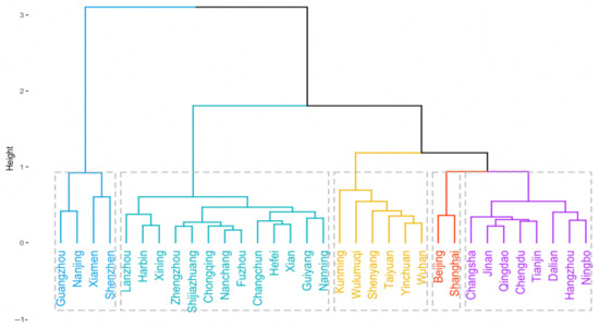 By using the similarity measure of the two cities defined above as the ()th element of the matrix, the similarity matrix of the observed multivariate functional data is obtained. Then, the classical hierarchical clustering method is used for the study of sustainable urban development level differences.