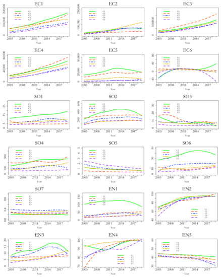 Economic development is a prerequisite for the sustainable development of a city. Among the economic development indicators, a city’s overall economic development level is the basis for the assessment factors of sustainable urban development capacity [65]. Sustainable economic development reflects the city’s economic development, and the macroeconomic indicators can reflect the status and changes of the city’s economic development to a certain extent [11]. Therefore, in the present study, EC1 is used to reflect the city’s economic strength and market scale, and EC6 is used to reflect the city’s economic development level changes within a certain period. The fundamental driving force of rapid urban economic growth is the high level of investment, which can reflect the level of sustainable economic development of a city at a certain level. Therefore, EC2 is used as the indicator of sustainable urban economic development. Sustainable economic development aims to raise people’s income and living standards. The EC3 and EC4 factors are selected as indicators because the former reflects the financial living standards of city inhabitants and the latter reflects the average household income of city residents. Furthermore, EC5 is used to represent the city’s economic size in terms of foreign commerce because import and export data are crucial indicators of the city’s sustainable economic direction.