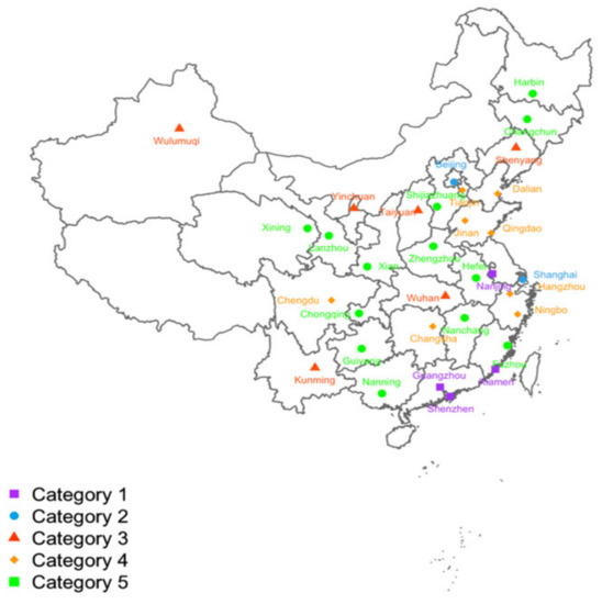 Based on the hierarchical clustering results, the clustering results for 33 cities are visualized (Figure 5). Four cities are included in the first category (purple squares), and they are located in Southeastern China. Two cities are included in the second category (blue circles). Six cities are included in the third category (red triangles), and they are mainly located in the eastern coastal areas and central regions of China. Eight cities are included in the fourth category (orange diamonds), and they are mainly located in the eastern coastal areas and central regions of China. Thirteen cities are included in the fifth category (green squares), and they are mainly located in the western region. The figure shows that cities are clustered spatially, and most cities with high levels of sustainable development are located in the eastern coastal regions of China, whereas those with low levels of sustainable development are located in the western areas of China. Cities in these ‘high’ clusters with relatively high levels of sustainable development can fully share resources, optimize their industrial structures, and use their respective strengths to promote sustainable urban development. Therefore, cities in clusters often have a close relationship and influence sustainable development [25].