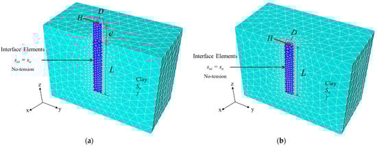 Figure 1 shows the problem statement of 3D rigid circular piles using 3D meshes from OptumG3. A free-headed (unrestrained) pile is shown in Figure 1a, whilst Figure 1b shows a fixed-headed (restrained) pile. The pile is subjected to a horizontal load (H). Since the problem of a monotonically and laterally loaded pile is symmetrical, only half of the model is used in all analyses. The rigid circular pile has a diameter (D) and a length (L). To model the interface between piles and soils, zero-thickness interface elements are used. The undrained shear strength at the interface is equal to that of the surrounding soil (i.e., sui = su) which means that the adhesion factor at the interface is equal to one (α = 1). In addition, the tension cut-off condition at the soil–pile interface is adopted, which allows the soil to separate from the back of the circular pile whenever “necessary” during the solution process (see [,,,]). Additionally, the tension cut-off condition is implemented at the soil–pile interface, allowing the soil to separate from the rectangular pile’s backside since it was required throughout the solution procedure. By using OptumG3, the interface elements are added at the soil–pile interface, where the properties of this interface are the same as the surrounding clay, except the tension stresses are not allowed to take place at the interface. The surrounding clay is defined as homogeneous and isotropic clays with an elastic–perfectly plastic material obeying the Tresca failure criterion. The soil parameters required for the model are the undrained shear strength (su) and the soil unit weight (γ). Note the eccentric length (e) in a free-headed pile (see Figure 1a). On the other hand, in Figure 1b, there is no eccentric length for a fixed-headed pile since the top of the pile is restrained against vertical movement and thus pile rotation. Sloan [] stated that the stability analysis using the FELA based on the limit analysis theory requires only the conventional strength parameters, such as undrained shear strength, but does not use the deformation parameters, such as Poisson’s ratio and Young’s modulus, which is different from the conventional displacement-based FEM. Thus, the Poisson’s ratio and Young’s modulus are not considered in this study using FELA. Hence, the displacements of the pile cannot be investigated by using FELA.