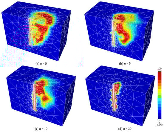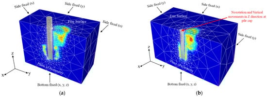 In all numerical analyses of the paper, the model domains are built to be sufficiently large so that collapsible areas are fully contained, and the failure zone would not reach or intersect the far boundaries of the model. The boundary conditions shown in Figure 2 are described next. At the domain bottom, zero velocity is applied in x-y-z directions so that there is no movement in the bottom plane in any direction. On all three side-planes, only the velocity in normal directions is fixed so that the roller supports are applied along all side planes. This condition is the same as the symmetrical plane where all nodes are fixed in the normal direction. The other two tangential directions are free to move. On the top plane of soils is a free surface, and the nodes are free to move in all directions. Note that a special boundary condition is given to the fixed-headed pile, where movement in the vertical direction is not permitted at the pile cap. In this way, no rotation can occur to the pile. The sizes of boundaries are selected to be large enough to confirm the failure zones are captured within the boundary domain so that it cannot cause an insignificant effect on the computed FELA solutions. However, the extremely large size of the domain can result in an increase in the number of elements directly reducing the computational performance of numerical simulations (i.e., increasing calculation time). Based on several trial-and-error checks, the optimal sizes of the model are 5D × 10D × 1.4 L for the width, length, and depth of the domain (see Figure 2).