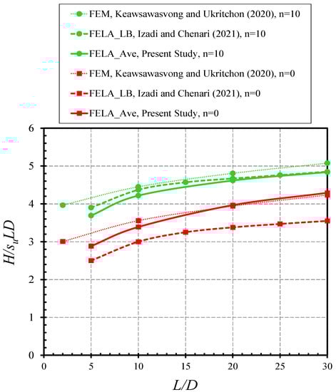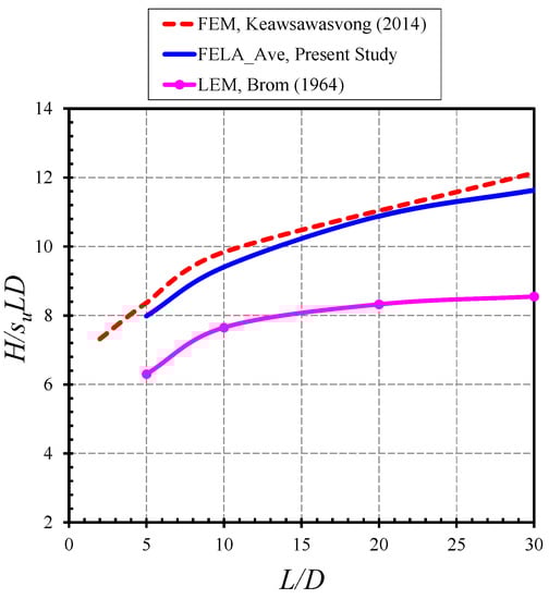 To verify the numerical results presented in the paper, Figure 3 compares the free-headed results of the present study with those from the displacement finite element method (FEM) by Keawsawasvong and Ukritchon [] as well as the lower bound (LB) finite element limit analysis (FELA) by Izadi and Chenari []. The presented results are the average solutions of H/(suLD) from the UB and LB solutions, and they are for cases of e/D = 0 and n = γL/su = (0, 5, and 10). In general, the present average solutions are in good agreement with those published solutions. All solutions indicate that an increase in L/D results in a nonlinear rise of H/(suLD). The larger the overburden stress factor n, the greater the H/(suLD). For n = 0 (i.e., weightless soil), the LB solutions by Izadi and Chenari [] are over-conservative as they are lower than the present solutions by 15–20%.