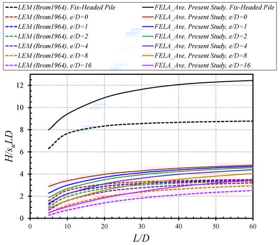 A comprehensive comparison with the classic LEM solutions in Broms [] is presented in Figure 5 for both fixed-headed piles and free-headed piles with e/D = 0–16. Since the work presented by the author did not consider the soil unit weight, therefore, the comparison is for the case of n = 0. Numerical comparisons have shown that Broms’s LEM solutions are conservative, as they are consistently lower than those in the present study for all cases of both free- and fixed-headed piles.