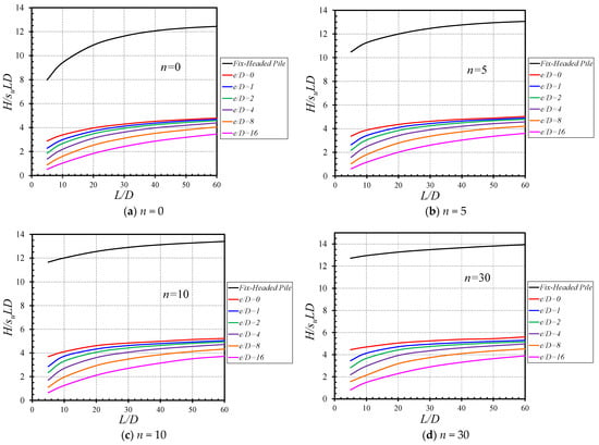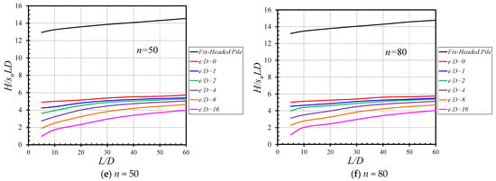 The influences of L/D on H/(suLD) are presented in Figure 6 for the various values of (e/D = 0–16) and (n = 0–80). In Figure 6a, where n = 0, an increase in L/D results in a nonlinear increase in H/(suLD). The larger the e/D, the smaller the H/(suLD). Numerical results have shown that the fixed-headed piles yield greater values of H/(suLD) than those of the free-headed piles. Interestingly, the difference between the two piles is not small which is about three times larger than the free-headed pile with e/D = 0. The same observation applies to other values of n, which are also presented in Figure 6b–f. The maximum and minimum values of each case (different n and e/D) can be found in Table 2.