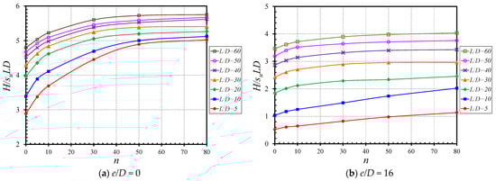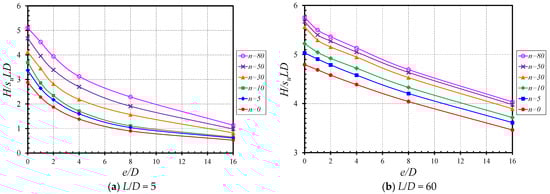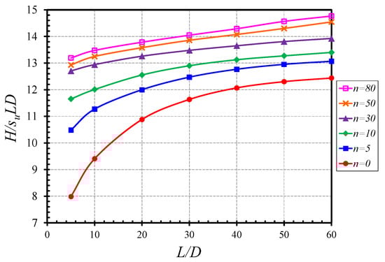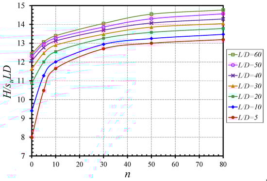 Figure 8 presents the influences of n on H/(suLD) for the various values of L/D. In Figure 8a (e/D = 0), numerical results have shown a nonlinear increase with the increasing n values. It is to be noted that the individual nonlinear curve reaches a constant value of H/(suLD) at approximately n = 50. On the other hand, as for e/D = 16 (see Figure 8b), the nonlinear curves are much flatter. The gradients are significantly lower than those in Figure 8a (e/D = 0).