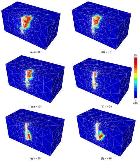 Effect of n on failure mechanisms (fixed-headed, e/D = 0, L/D = 30). (a) n = 0; (b) n = 5; (c) n = 10; (d) n = 30; (e) n = 50; (f) n = 80.
