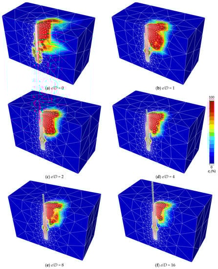 In Figure 12, the effects of the ratio of eccentric length to pile diameter e/D on the failure mechanisms of a free-headed pile are presented. The chosen free-headed pile is for (n = 10, L/D = 30). As e/D increases (i.e., the pile length above the ground surface increases), the size of the passive failure zone (see the colored area near the ground surface) decreases. Nevertheless, unlike in Figure 11, the developed active zone near the pile tip is not pronounced. One of the possible reasons for this could be attributed to a location change of the inflection point of the pile as e/D increases.