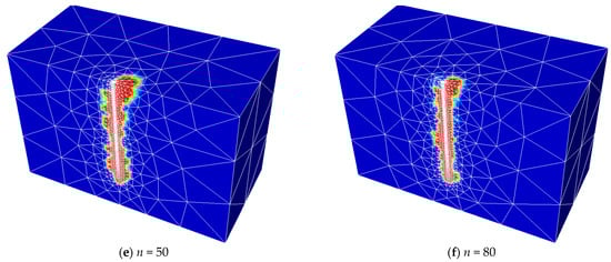 One of OptumG3’s advanced features is the automatic adaptive mesh refinement scheme, which is based on the previous development in Ciria et al. []. The numbers of meshes in sensitive zones with very high shear power dissipation, which is the control variable for error estimation in all analyses, are automatically increased through successive iterations using the adaptive technique. The original and targeted number of elements used in all numerical runs are 5000 and 10,000 elements with five adaptive iterations [,,,,,]. Utilizing the adaptive mesh techniques, meshes will automatically enlarge in sensitive zones with considerable plastic shearing strain. All numerical simulations employ 5000 to 10,000 elements as the initial and goal number of elements, respectively, with five adaptive iterations. Examples of the final mesh refinements for a free-headed pile and a fixed-headed pile are shown in Figure 2a,b, respectively.