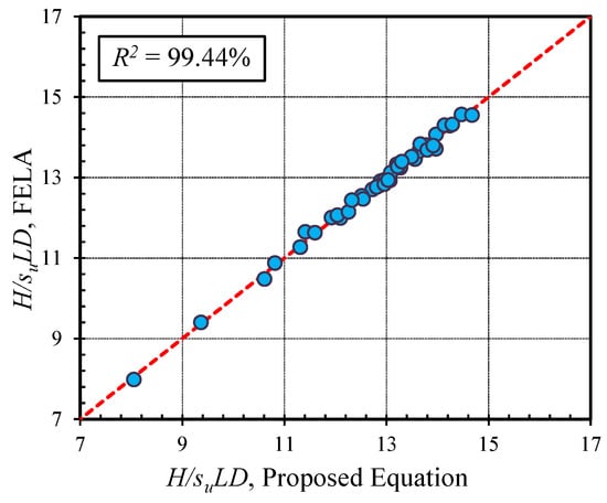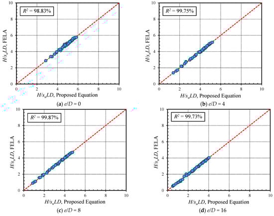 A comparison of the H/(suLD) values between the FELA solutions (Avg) and the proposed design equation is shown in Figure 14 for the purpose of verifying the equation uses for the fixed-headed piles. For the free-headed piles, the comparisons are shown in Figure 15a–d, respectively, for the four different values of e/D. The comparisons have shown that the coefficients of determination (R2) are all greater than 99.44%. The proposed Equation (3) is considered as highly accurate with the coefficients provided in Table 3, and it can be used with confidence in practice to estimate the lateral capacity of a pile in cohesive soil.