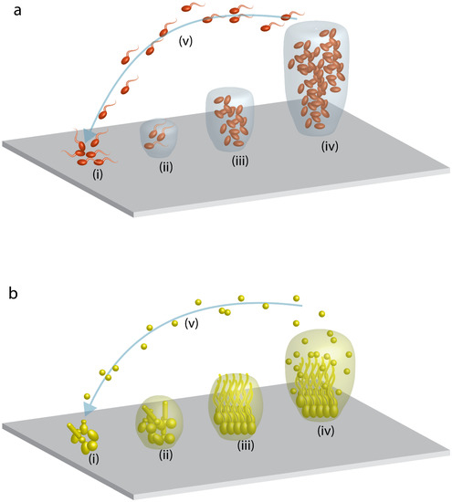 The five steps that are related to the biofilm formation in bacteria (a) and Candida albicans (b) are as follows: (i) adsorption, (ii) adhesion, (iii) microcolony development, (iv) mature biofilm, and (v) dispersal [70,72,73,74].