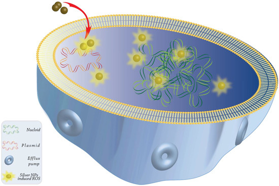 Recent discoveries in the structure and composition of fungal cell walls, in addition to their role in the development of drug resistance, have paved the way for the discovery of new targets for the treatment of fungal pathogens and contributed to a deeper understanding of the mechanisms underlying the evolution of antifungal resistance. Indeed, Ag nanoparticles have the potential to play a significant part in overcoming such resistance. The disintegration of the cellular wall, damage to nucleic acids and surface proteins caused by generation and accumulation of free radicals or reactive oxygen species (ROS), and the obstruction of proton pumps are the results of exposure to Ag nanoparticles. The accumulation of silver ions, which inhibits respiration by preventing the outflow of intracellular ions and, therefore, causes harm to the electron transport system, has been thought to be triggered by Ag nanoparticles [102]. The antifungal action of nanoparticles can be related to their smaller size in comparison to their larger surface area. These Ag nanoparticles of a lower size are able to readily pass through the cell membranes of their targets. To be more specific, silver nanoparticles with sizes ranging from 10 to 15 nm have improved durability, biocompatibility, and antimicrobial activities [103]. The generation of ROS, which ultimately results in apoptosis, is largely responsible for the toxicity of silver nanoparticles. The in vitro toxic effects of silver nanoparticles have been hypothesized to be induced either by the combined action of silver ions and Ag nanoparticles or by each of their individual effects [102,104]. According to the findings of a study, silver nanoparticles induce cellular damage to walls and also the cell membrane. They are capable of penetrating inside the cells, damaging organelles, such as mitochondria and ribosomes, and they are capable of inducing condensation and the margination of chromatin, which is a marker of apoptotic cell death [105]. Additionally, because of their tiny size, the silver nanoparticles have the potential to attach themselves to the cellular surface, enter the cells directly without causing any damage to the cell wall, and ultimately result in the death of the cell. It was demonstrated in a previous study on the bactericidal action of silver nanoparticles that the breakdown of the membranes of Escherichia coli might lead to the death of these bacteria because silver nanoparticles dramatically increase their permeability, which, ultimately, results in aberrant transport through the cellular membranes and cell death [106]. It was previously assumed that silver nanoparticles with high surface areas could readily generate Ag+, which would then attach to the functional groups (−SH) in proteins and cause the proteins to become denaturized. By binding to the surface proteins of fungi, silver nanoparticles have the potential to cause protein denaturation and also the destruction of proton pumps. This occurs as a result of an increase in the permeability of the protein–lipid bilayer or membrane, which ultimately leads to the disruption of the cellular membranes [107,108].