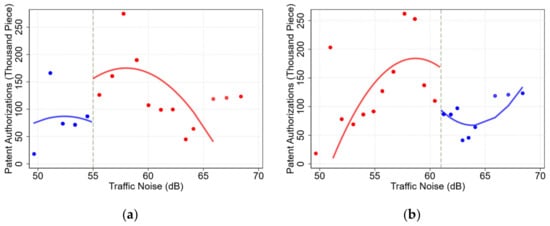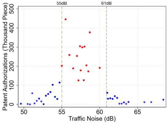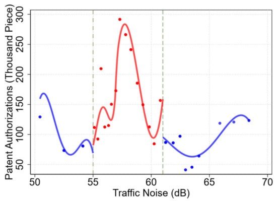 We referred to the methods of Campante and Yanagizawa-Drott to construct a scatter diagram of city patent authorization and traffic noise (Figure 1) []. There was a decrease in the number of patent authorizations when the traffic noise increased above 61 dB. However, when the traffic noise was between 55 and 61 dB, the number of patent authorizations was elevated. This discontinuity provides a strategy to identify the causal relationship between traffic noise and patent authorization. More than 50% of the variability in the number of patent authorizations is accounted for by traffic noise (Appendix A).