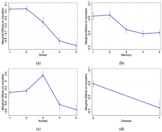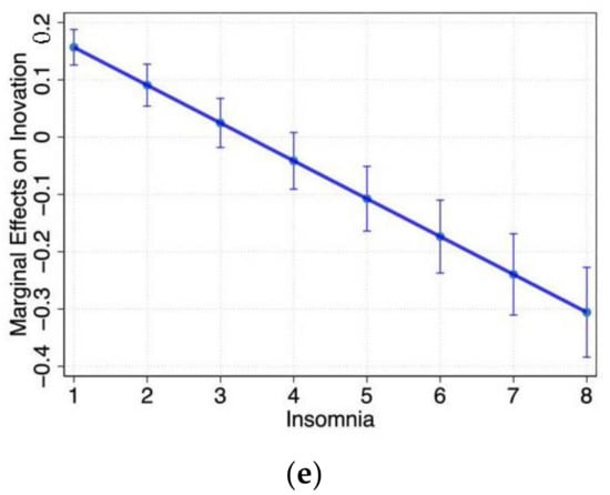 Figure 2c illustrates the anxiety levels. The marginal effect curve rose first and then decreased, which indicates that slight anxiety can alleviate the impact of traffic noise on innovation and severe anxiety worsens innovation. With the aggravation of anxiety, the effect of traffic noise on innovation diminished. Figure 2d shows the case of noise-related diseases that according to Burden of Disease from Environmental Noise released by World Health Organization. The marginal effect of traffic noise on innovation was −0.20 when there was no disease, whereas when there was a disease, the marginal effect of traffic noise on innovation was −0.37. Therefore, the presence of disease increased the absolute value of the marginal effect by 0.17. Figure 2e shows the situation of insomnia, which is a continuous variable. The marginal effect of traffic noise gradually decreased with the increasing duration of insomnia.