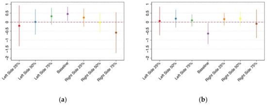 where is a polynomial function, and the requirements on the form of function can be relaxed by limiting the samples near the cutoff. The distance between the selected sample and the cutoff is referred to as the bandwidth; the smaller the bandwidth, the smaller the requirements for the control variable and form, but more sample observations will be lost, and the parameter estimation error will increase. In the subsequent analysis, we used the methods described by Imbens and Kalyanaraman (2012) to calculate the optimal bandwidth [], report the estimation results using multiple bandwidth settings near the optimal bandwidth, and demonstrate the robustness of the model.