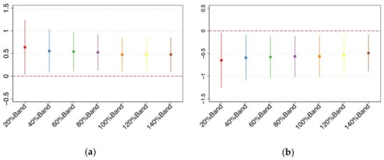 In the regression discontinuity analysis, the bandwidth may impact the regression results. Even though the optimal bandwidth was used in the regression discontinuity, a robust result requires less sensitivity to the bandwidth length. Because of this, we further evaluated the sensitivity of the bandwidth. Specifically, by setting the bandwidth to 20, 40, 60, 80, 100, 120, and 140% of the optimal bandwidth. The coefficients and 95% confidence intervals of the regression results are shown in Figure 5.