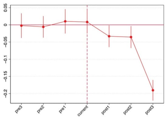 In this study, the three periods before and after the highway’s opening were used as explanatory variables for regression with control variables, year fixed effect, and city fixed effect. The coefficient of each explanatory variable and the corresponding 95% confidence interval were included. As shown in Figure 7, in the three periods before the highway’s opening, the coefficient was not significantly different from 0, and the coefficient fluctuated around 0, indicating no significant difference between the control and experimental groups. After the highway’s opening, the coefficients were significantly greater than 0, indicating that the highway noise reduced the innovation level of the enterprise. Therefore, the difference-in-differences model designed in this study conforms to the balance trend and can effectively identify the treatment effect.