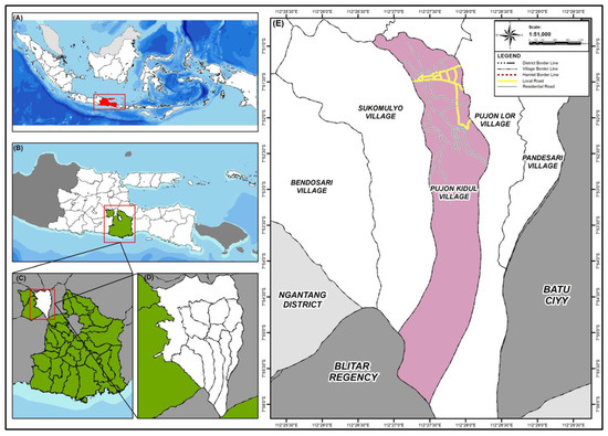 Map of the study area (A) East Jawa, Indonesia. (B) Malang Regency, East Jawa. (C) Map of Malang Regency, the highlighted area shows Pujon District. (D) Villages in Pujon District. (E) Map of Pujon Kidul Village.
