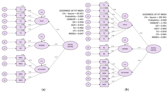 This is a figure from the CFA analysis. (a) The first stage of the social capital CFA model. (b) The second stage of the social capital CFA model.