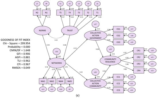Based on the estimated value and goodness of fit (Figure 7a–c) of the three SEM models, model 3 was the fittest model among the three alternative models. This is because in the path diagram’s depiction, the model’s eligibility requirements were at least 4–5 GOFI criteria, and the three models were fit. However, model 3 was the fittest because it met five criteria. There is a lower chi-squared limit value of 299.954 (lower than the df limit value), the CMIN/DF value was 1.648, the GFI value was 0.906, the AGFI value was 0.881, the TLI value was 0.962, the CFI value was 0.967, and the RMSEA value was 0.049. Meanwhile, the relationship between the variables described in model 3 is a direct relationship between the two variables of trust and norms. The relationship between the two is directly related to the network, and the network is directly related to the community’s collective action that affects community resilience.