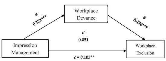 Regression analysis was utilized to test all analyses. To test the mediating role of workplace deviance, we adopted analytical approaches using the PROCESS macro model 4 [73]. According to [74,75], only significant control variables were included in the further step. Thus, all of the control variables that were uncorrelated and not significant in the regression analyses were excluded from the analysis. Table 2 shows that both the direct and indirect effects of IM on workplace exclusion were significant.