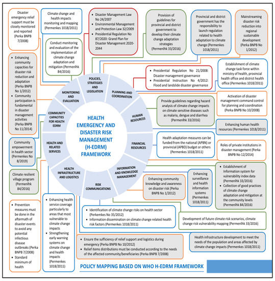 The Sendai Framework for Disaster Risk Reduction (SFDRR)2015–2030 aims to prevent new, and reduce existing, disaster risks, outlining targets and priority action plans for all member states. The framework drives significant progress in developing institutions and policies for mitigating disaster risks, it highlights “health” as both means and a goal. The health-focused measures are cited as a means to reduce disaster losses. Four out of the seven global targets are directly related to health [1]. To promote effective implementation of the SFDRR, the World Health Organization (WHO) published the Health Emergency and Disaster Risk Management (Health-EDRM) framework to set core principles and approaches that guide policy and practice of responses from international to local level [2]. It also recognizes that health should be centrally embedded in the current risk management institutions. The approaches are needed to align policies and actions to manage the steep rise in climate-related disaster events [3,4]. The presumption was (and is) that critical components including defined structures, roles, and responsibilities of governments and other actors present an opportunity to mitigate the increased disaster risks. There has been much discussion about disaster management policies to implement surveillance, early warning, and alert systems that enhance emergency preparedness for response across all hazards [5,6,7]. However, in Indonesia several studies showed that policies at the national level are not adequately responded to at the provincial and local levels [8,9,10,11].