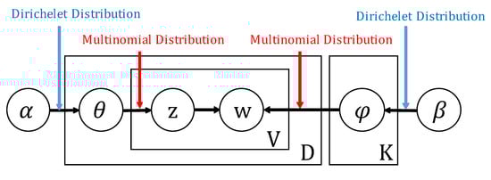 In LDA, we assume that each lexicon belongs to a latent topic . We assume that each document has a different topic distribution , and each topic k has a different vocabulary distribution . If we ignore the order in which words appear in a document, and consider only the cohesion of words that co-occur in a document, these can be expressed by Equations (1) and (2) using the multinomial distribution.