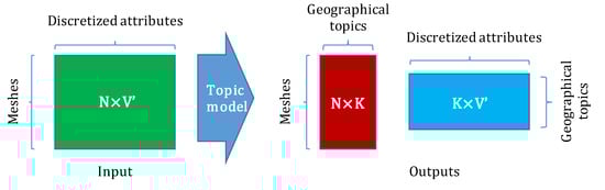 The output of the topic model is an N × K matrix Θ, where the rows represent the mesh and the columns represent the distribution of geographic topics, and a K × V’ matrix Φ, where the rows represent the geographic topics and the columns represent the distribution of class-specific attributes, as shown in Figure 2. The former reveals the relationship between meshes and geographic topics, and the latter reveals the dominant class-attributes composes of a geographic topic. In Θ, the higher/lower values for columns of a row show the dominant/minor discretized attribute of the geographic topic, thus a set of them gives the characteristics of a mesh. In other words, Θ can be considered as a set of factor loading vectors of each mesh. In Φ, the higher/lower values for columns of a row show the dominant/minor class-attributes that are likely to co-occur in a geographical topic. In other words, Φ can be considered as a set of class-attributes loading vectors of each topic, so it gives the interpretations of geographic topics.