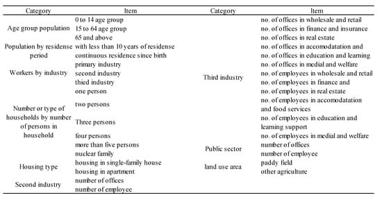 The dataset used in this study is the Kyusyuu and Fukuoka metropolitan areas, recorded in 2000 and 2010. We can set a much later period for study, but any period is possible for testing the applicability of the geographical model. Another reason for setting the period 2000–2010 is that the demographic trends in Fukuoka and Kitakyushu are more contrasting in this period than in any other. The population of Fukuoka metropolitan area in 2000 and in 2010 are about 2.337 million and 2.513 million, respectively, while the population of Kitakyusyu metropolitan area in 2000 and in 2010 are about 1.481 million and 1.425, respectively (Census in Japan in 2000/2010). In the Kitakyusyu metropolitan area, a natural decrease of population was started in 2000 and social decrease of the population continued after 1985. In the Fukuoka metropolitan area, a natural increase and social increase of population was observed between 2000 to 2010. The sum of urbanized area is about 2000 squared kilometers. Thirty-four attributes are collected form the national census, economic census and office and company statistics, the attributes of which are shown in Figure 3. The number of meshes in the target area is totally 2113 for each cross section, by dropping the unused.