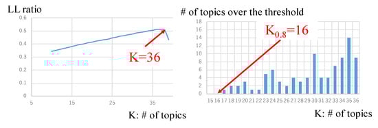 As shown in Equation (12), initial LL of topic model depends on N and V, but is irrelevant to K. In this study, LL ratio given by initial LL and LL at the last or the converged is used to compare the models.