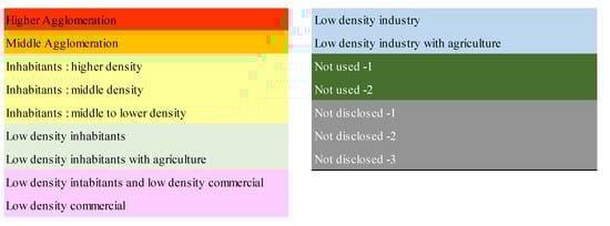 In 2014, a land use plan named the “Grand Design of Japan in 2050” was announced by the Ministry of Land, Infrastructure, Transport and Tourism (MLIT) in Japan, which proposed a “compact city” concept composed of spatially agglomerated bases for daily life and a network of frequent public transport connecting the bases. Miyauchi et al. (2021) analyzed suburban area size and urban population to find a stable relationship among them []. In order to mitigate the uncontrolled expansion of urban areas or reshape them into a sustainable form, many local governments have adopted the “compact city” as a goal of urban structure in their master plan for urban design, and policies were developed to encourage people to return to the city center []. Such policy making requires a detailed method of understanding the current state of land use.