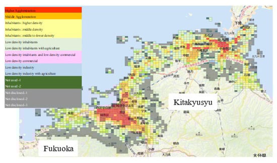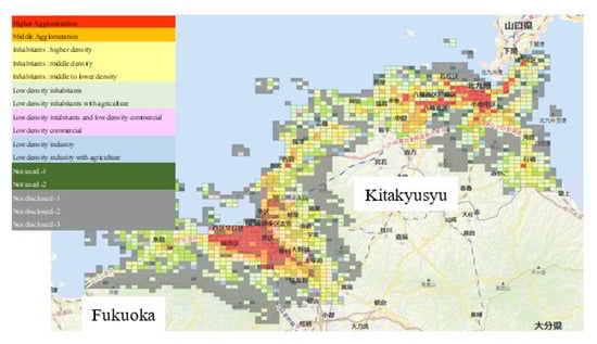The development of geo-statistical data and advances in GIS technology have made it possible to analyze land use and population dynamics in fine spatial units smaller than the municipality. In Japan, national land use data supplied by MLIT provide a land use dataset at the tertiary mesh level for multiple years across the entire land. In addition, the National Census and Economic Census provide data on population, households, and number of offices and employees, also at the tertiary mesh level. These standardized geographic information databases are useful for analyzing land use change and population dynamics, and have greatly contributed to the development of research on urban structure and urban policy []. However, when analyzing an entire city or region, the data handling for the number of meshes and their many attributes becomes a nuisance due to the enormous amount of information. While a map for each attribute, for example, is convenient for grasping that attribute’s characteristics at a glance, a large number of maps for individual attributes cannot give insights for the comprehensive assessment of the target area.