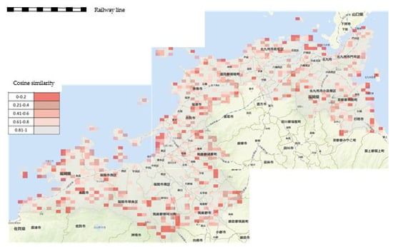 Change in land use by cosine similarity between 200 to 2010 in Fukuoka and Kitakyusyu metropolitan areas.