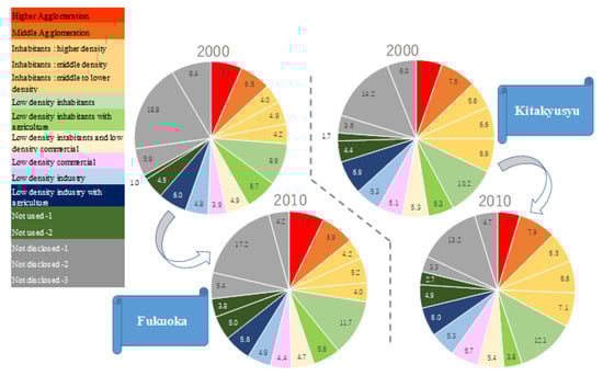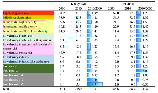 The development of built area in each topic are compared in both cities, shown in Figure 10. Overall increase of built area from 2000 to 2010 in Kitakyusyu is 1.31, and that in Fukuoka is 1.34, so then the increase ratio is not so different. Some of notable difference of built area development except not used and not opened class are found that as follows. Fukuoka has higher agglomeration topic (0.99 in Kitakyusyu: 1.25 in Fukuoka), higher density inhabitants (1.58 in Kitakyusyu: 1.92 in Fukuoka) and higher density commercial (1.33 in Kitakyusyu: 1.56 in Fukuoka). The development in built area indicates the decline of CBD area in Kitakyusyu. In Fukuoka, higher agglomeration area and middle agglomeration surrounding CBD can attract buildings. Further in Fukuoka, low density inhabitant area and low density commercial area are also attracting new buildings.