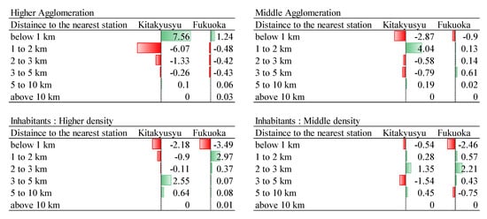In order to clarify the access to public transportation, the topic with larger inhabitants as higher agglomeration, middle agglomeration, inhabitants: higher density and inhabitants: middle density are focused to check the public transport access. The public transport in this aggregation includes the stations of Shin-kansen, other railway, subway and bus lines in 2014. Figure 11 shows the change in topic share by distance band. Focusing on higher agglomeration, Kitakyusyu succeeded in attracting it around the public transportation (below 1 km band), while it is decreased in the 1 to 2 km band. Fukuoka also shows the same tendency with Kitakyusyu, but the increase or decrease of the geographic topic was not apparent. In terms of middle agglomeration, it is significantly increased in 1 to 2 km band with significant decrease in below 1 km band in Kitakyusyu, while the increase is observed in 3 to 5 km band in Fukuoka. Same as higher agglomeration areas, the increase or decrease of the geographic topic is not so significant in Fukuoka. In the case of inhabitants: higher density, significant decrease of the topic is commonly observed in below 1 km band for both cities, but the increase of the topic occurs in 3 to 5 km in Kitakyusyu, while that occurs in the 1 to 2 km band in Fukuoka. About inhabitants: Middle density, significant increase is commonly observed in the 2 to 3 km band, while the decrease of the topic occurs 3 to 5 km in Kitakyusyu, while that occurs below 1 km in Fukuoka.