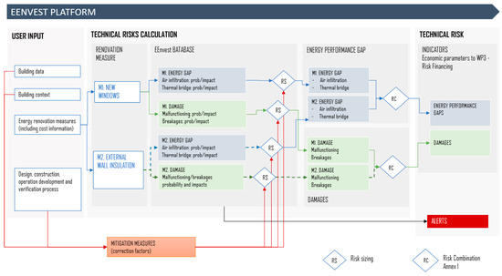 The EEnvest technical risks calculation method allows for the matching of several probability–impact data distributions of possible occurrences extracted from the data inputs of the building project. In the EEnvest web-platform, the EEnvest technical risk database is uploaded together with (i) several probabilistic impact data of possible occurrences and failures that can happen to the building elements and technical systems, (ii) correction factors (mitigation measures) used to modulate the effect of a risk, and (iii) alerts. The technical risk calculation process runs online on the EEnvest web-platform extracting from the EEnvest technical risk database all the technical risk combinations specific to a renovation strategy elaborated for a building, producing a technical risks probabilistic trend of impact and probability for both energy gap deviation and damage indicators. An overview of the technical risk calculation process in the EEnvest web-platform is reported in Figure 1.