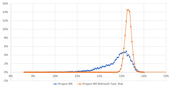 Project IRR distribution, considering all risks (blue line) and without technical risks (orange line)—Scenario 1.