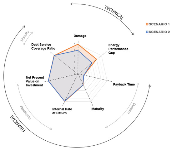 Results of the two scenarios of the technical and financial KPIs on the radar graph.