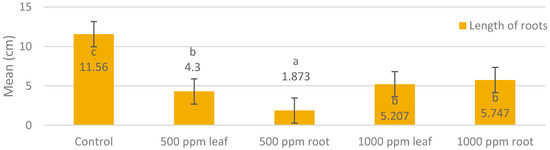 Root length was significantly reduced in the treated groups (Figure 1). The control stock, which did not receive any form of glyphosate treatment, had an average root length of 11.56 cm at the time of final evaluation, which is significantly different from all treated groups. For plants treated with a 500 ppm solution, the lowest value (1.873 cm) was measured in the group receiving the chemical through the root. There was no significant difference in root lengths between the 500 ppm leaf-treated and both 1000 ppm treatments.