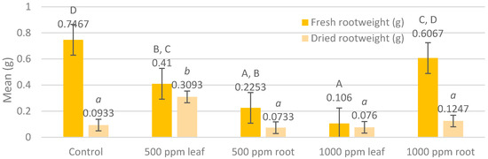 Comparing these data with fresh and dried root weights (Figure 2) it can be observed that the untreated group had the highest fresh root weight (0.7467 g), which was significantly different from the mean weight of the treated groups. The average fresh weight of the roots (0.6067 g) was also significantly higher in the 1000 ppm individuals treated through the root, but in this case, the root was also shorter. In the groups receiving the 500 ppm solution, the average fresh root weight of the leaf spray group was 0.41 g, from which the average fresh root weight of the glyphosate uptake (0.2253 g) was significantly different. The lowest fresh weight value was produced by the group receiving the leaf spray at a concentration of 1000 ppm (0.106 g). These data show that there are greater differences in the fresh weights of plants treated through the leaf and root than the higher concentration of glyphosate. For the groups receiving the 500 ppm solution, this difference, although showing some difference, is not significant. In summary, the effect of the 1000 ppm treatments, compared to each other, has already been shown in phenotypic properties. Compared to the control, much shorter, more fleshy roots were formed in sunflowers treated through roots at a concentration of 1000 ppm. Increased dry weight may indicate stress on the plant.