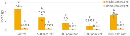Examining the stem weight results (Figure 3), clearly visible that the highest fresh (4.564 g) and dry (0.4253 g) stem weights were measured in the untreated individuals. These data show a significant difference with the results of all treated groups. The results of the parameters were analogous to the values measured at the roots, so the results measured in the group treated through roots with a concentration of 1000 ppm were significantly higher, both statistically, in the case of fresh (3.2447 g) and dried stems (0.336 g). This shows that absorption through the root is slower than in the case of leaf treatment with the same concentration solution, which produced almost the lowest measured average weight for fresh (0.8953 g) and dry weight (0.176 g). In the case of the treatment obtained with a solution concentration of 500 ppm, the opposite was observed, whereby the individuals receiving the leaf spray achieved a higher fresh and dried stem weight than the individuals treated through the root.