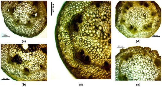 Root cross sections after glyphosate treatments: (a) 500 ppm concentration root treatment; (b) 500 ppm concentration leaf treatment; (c) control treatment; (d) 1000 ppm root treatment; (e) 1000 ppm leaf treatment (Budapest, 2021).