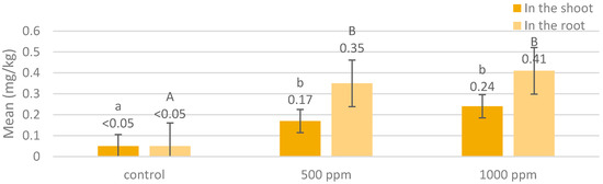 In the case of residue measurements, the root and stem parts were evaluated separately (Figure 5). This was considered important because it allows the extent of glyphosate uptake by the root to be monitored even more. Glyphosate accumulated in both leaf-treated and root-treated plants when treated with 500 ppm and 1000 ppm solutions, respectively. The amount detectable for the latter is higher in both concentrations compared to the control treatment. We found that in plants treated with leaf spray, the residue value was significantly higher in the root than in the stem.