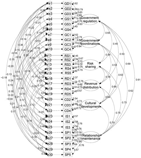 The results in Table 7 show that six factors are identified for project governance in mega-infrastructure. Factor 1 includes items IS2, IS3, SP4, IS1, SP5, SP3, SP1, and SP2, namely three items of information sharing (IS) and five items of problem solving (SP). These items can reflect the measures of maintaining the relationship, so factor 1 is named as relationship maintenance. Factor 2 includes items GD1, GD3, GD2, GS1, GS3, and GS4, namely three items of government decision (GD) and three items of government supervision (GS). These items can reflect the governing measures by the government, thus factor 2 is merged as government regulation. Factor 3 includes items GC3, GC1, GC2, and GC4, which are consistent with the governmental coordination of governmental governance; thereby, it is retained as governmental coordination. Factor 4 includes items RS2, RS1, RS3, RS4, and RS5, which are consistent with the risk sharing (RS) of contractual governance—hence, retained as risk sharing. Factor 5 includes items RD4, RD5, RD1, and RD3, which are consistent with the revenue distribution (RD) of contractual governance (except item RD2). Therefore, the name is retained as revenue distribution. Factor 6, including items CD2, CD3, and CD4, is consistent with the cultural development (CD) of relational governance (except item CQ1); therewith the name is retained as cultural development.