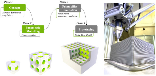 The proposed research is developed in four phases: (i) conception and design; (ii) parametric modeling; (iii) simulation and printability; (iv) prototyping. Figure 1 shows a flowchart of the four phases of the methodology (in the top left part) and the novel conceptual design and prototyping of the 3D-printed clay brick (in the bottom).