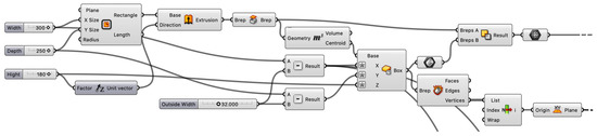 (i) The generation of the external shell starts from the definition of a rectangle parallelepiped by using the components rectangle, extrusion, and cap holes (by respecting the length, width, and height constraint defined in Section 2.1). By employing the component centre box and solid difference, the thickness of the external wall is completed. More in detail, these last two components operate a Boolean difference between the first parallelepiped and another one with the centre in common, i.e., the same height but reduced width and length on the basis of the desired thickness.