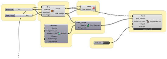 The third phase of the methodology is devoted to performing a finite element modeling (FEM) analysis of the printability of the internal cells of the bricks. Such analyses are aimed to identify the most effective minimum surfaces and the number of repetitions of the geometry within the brick. The approach is based on an effective plug-in named VoxelPrint for Grasshopper [23] that can be used to construct simulation files, designed specifically for 3D printing applications for viscous material, such as concrete. Such plugin exploits voxelization of the designed three-dimensional shapes into a set of identical finite elements and it produces ready-to-use input files for simulation in Abaqus. The approach has been initially developed for concrete printing. On the other hand, in this work, the material parameters (that can be included in the tool) are modified and adapted to simulate clay extrusion instead of concrete. The visual scripting is reported in Figure 3 and the used components are listed in the following: BerpToVoxel, Material, PrintSetting, VoxelPreview, and VoxelToAbaqus.